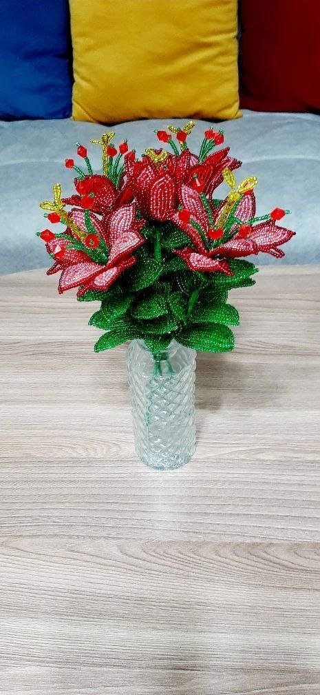 Элегантные лилии в вазе из бисера — стильный аксессуар вашего интерьера! Размер композиции 28 см позволяет гармонично вписать ее даже в небольшое пространство. Декоративное украшение станет прекрасным подарком близким людям, подчеркнёт вашу индивидуальность и создаст атмосферу тепла и уюта без лишних затрат времени и средств. Не требует ухода и сохраняет привлекательность долгие годы.